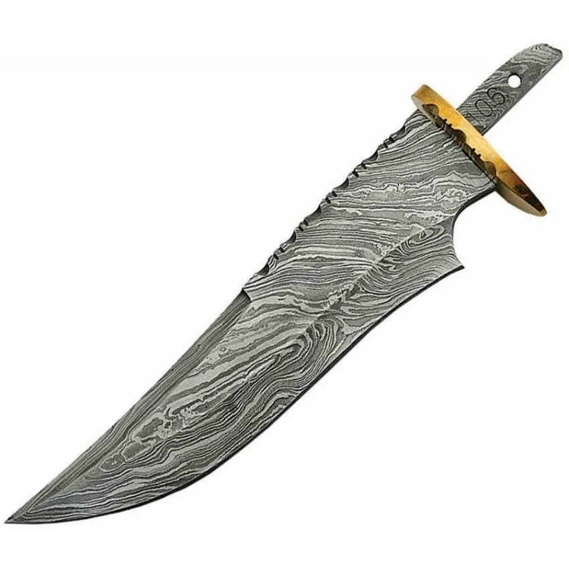 Lame seule à customiser le manche. Longueur totale 20,95cm – Longueur de la lame 16,51cm – Lame en acier damas 256 couches – Dos de la lame guilloché – Lame lisse – Garde en laiton – Etui cuir marron.