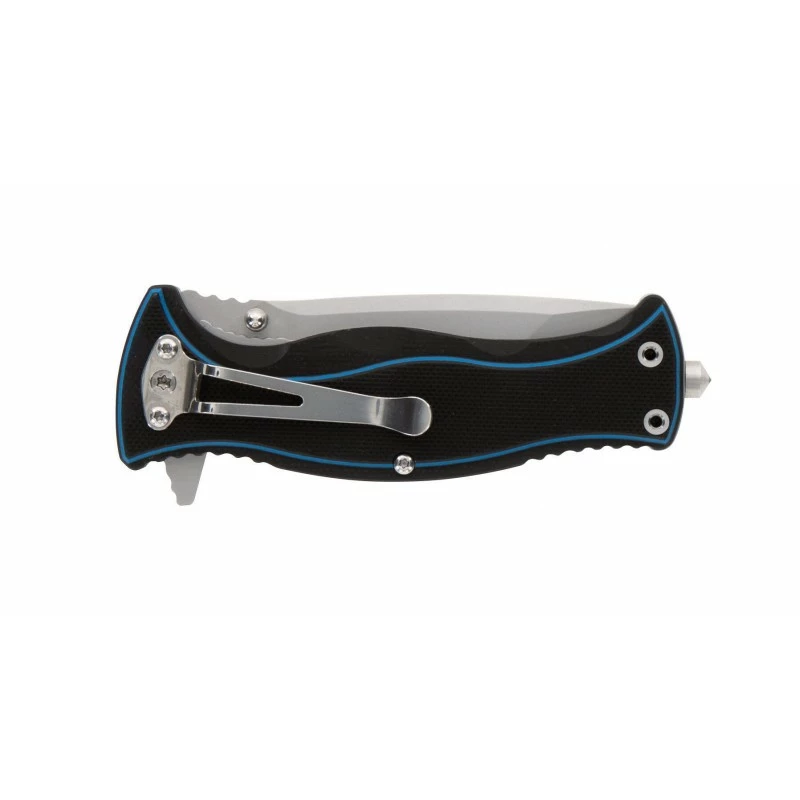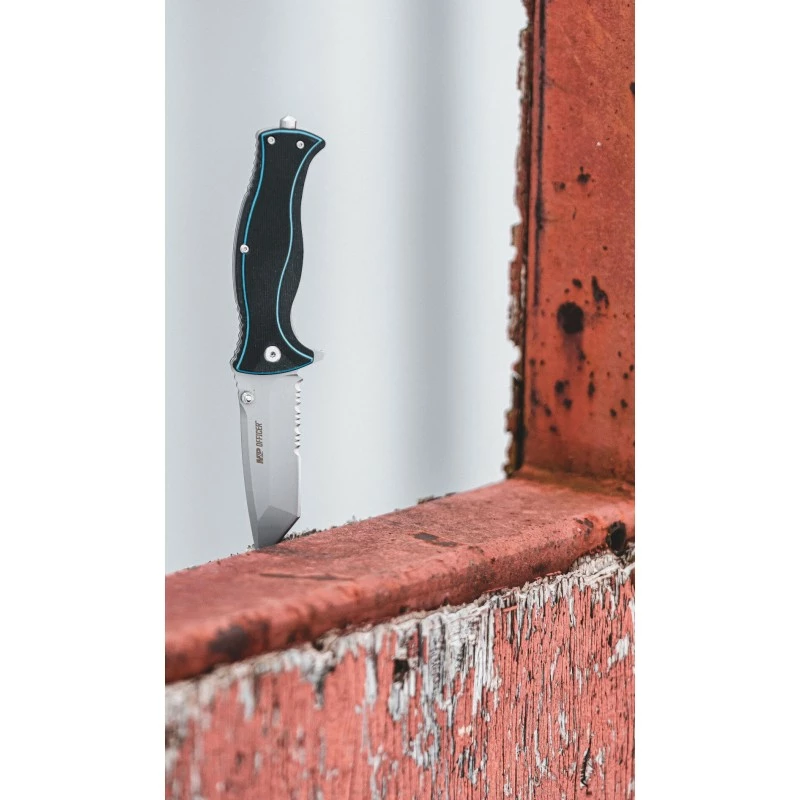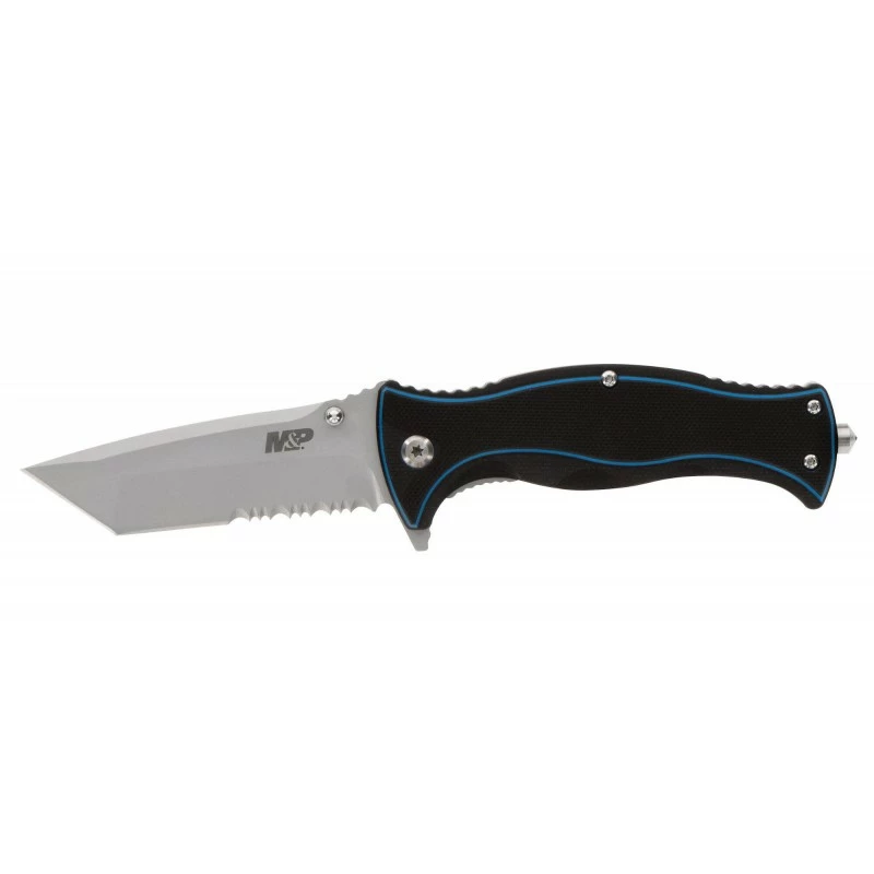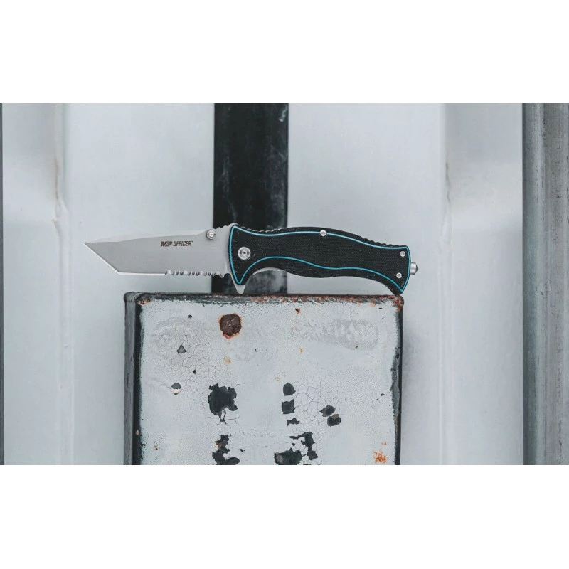 Couteau Tactical Smith&Wesson M&P Officer 8Cr13MoV Tanto Black/Blue G10 Linerlock Clip pliant – Longueur ouvert 18.54cm – Longueur fermé 11.76cm – Longueur de la lame 7.87cm – Lame de type tanto partiellement serrated finition satin – Lame en acier 8Cr13MoV – Dureté 58 59HRC – Platines en acier – Lame sur pivot avec roulements à billes (Ultra-Glide Ball Bearings) – Plaquettes du manche Black/Blue G10 – Ouverture d’une main avec le thumb & le flipper – Système de sécurité linerlock – Clip de poche – Couteau Longtemps réservé aux Forces Spécial Military & Police maintenant disponible au public