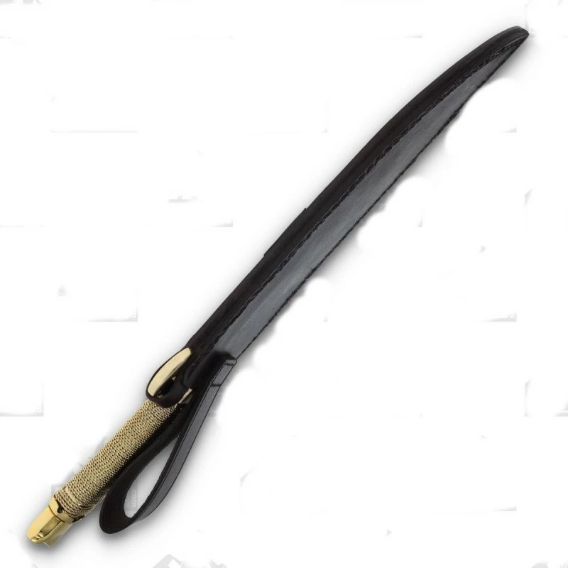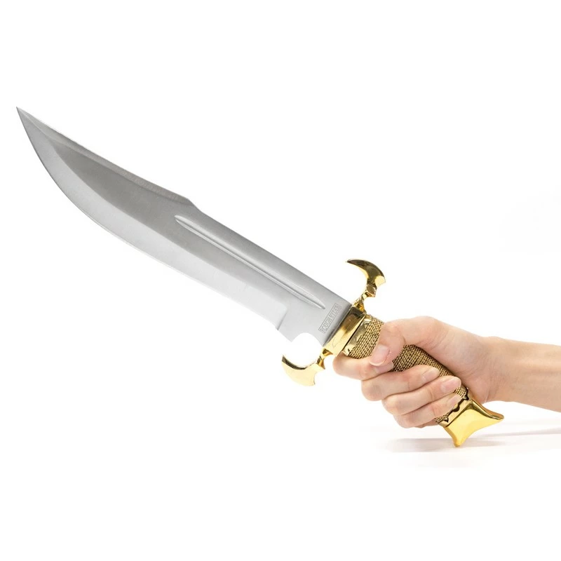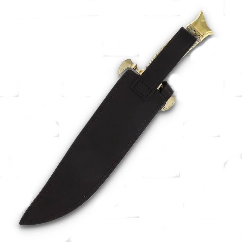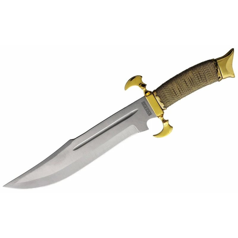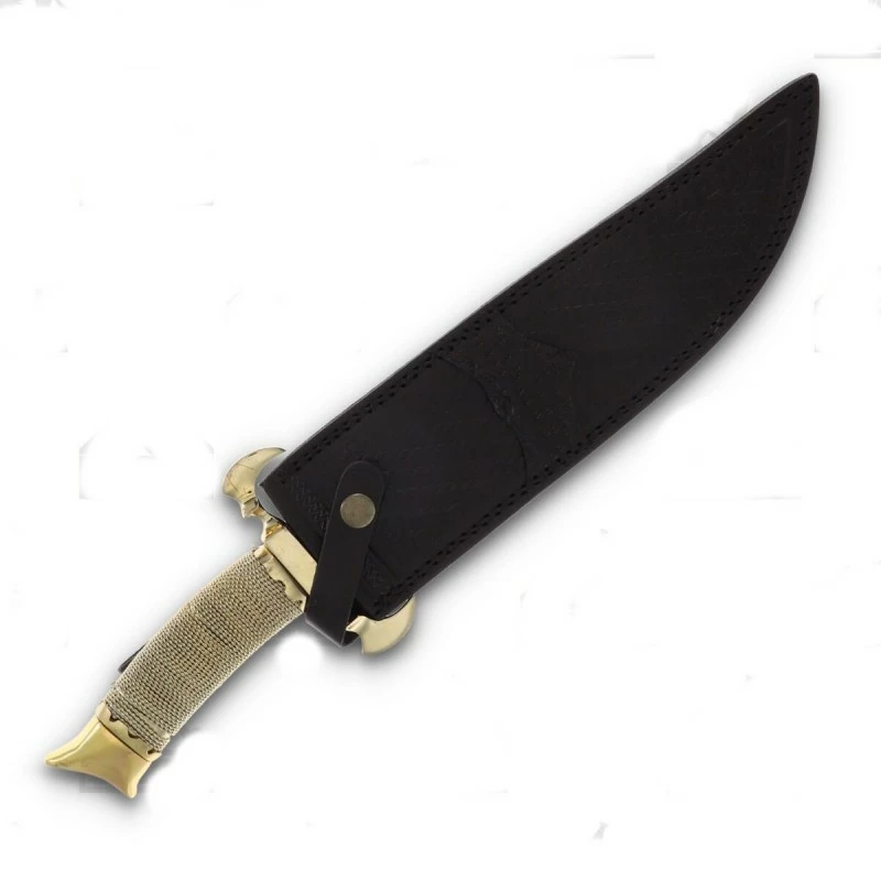 40.64cm overall. 26.04cm satin finish 440 stainless bowie blade. Gold wire wrapped handle. Brass guard and pommel. Brown leather belt sheath. Boxed.