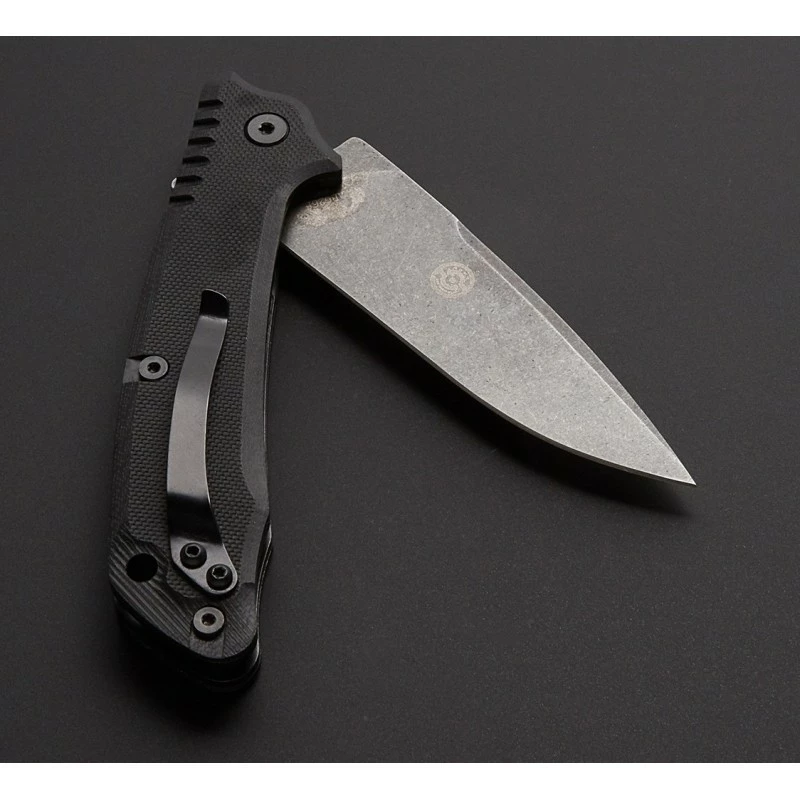 12.06cm closed. 9.52cm black stonewash finish D2 tool steel drop point blade. 57-61HRC. Black G10 handle. Extended tang. Pocket clip. Lanyard hole. Boxed.