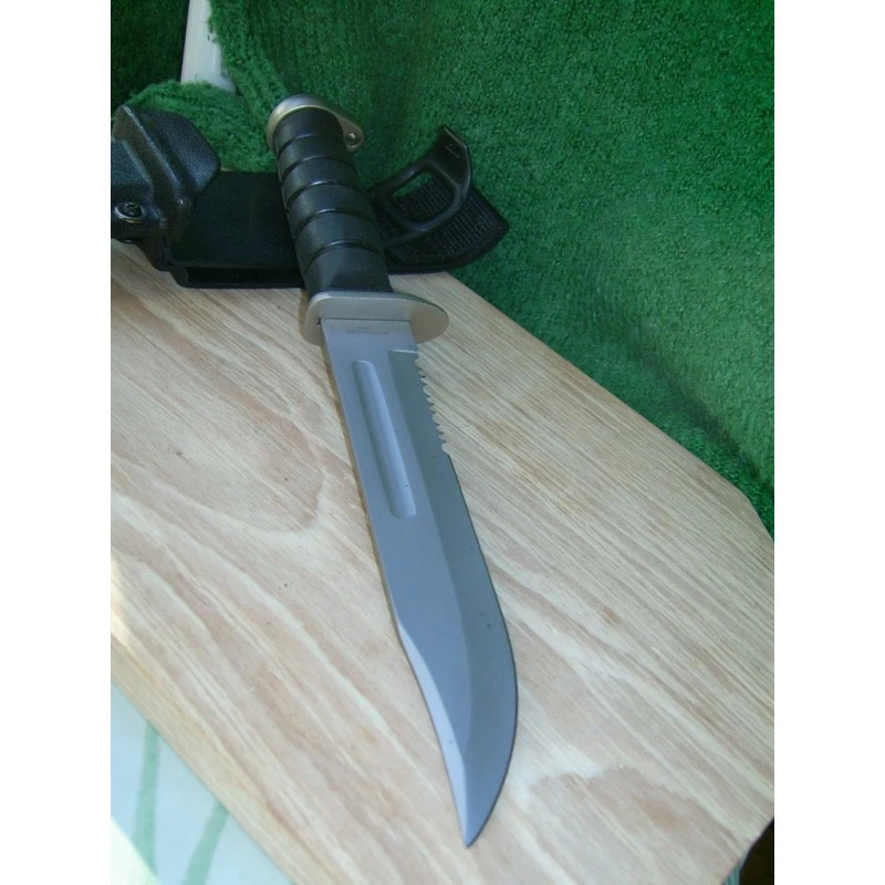 F15414M Frost Cutlery Combat Fighter I Matte 12″ overall. 7 1/4″ matte finish stainless partially serrated blade. Grooved black rubber handle with matte finish stainless finger guard and pommel. Molded black composition belt sheath with black cord lanyard.
