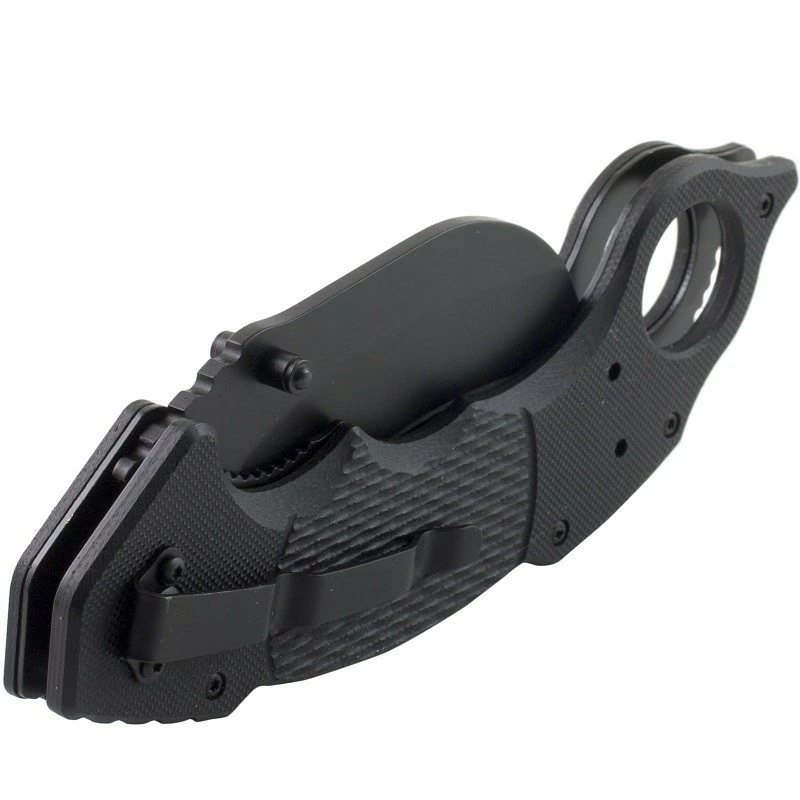 Measures 5 3/4″ (14.6 cm) closed with 2 3/4″ (7 cm) black finish stainless karambit blade with dual thumb studs.