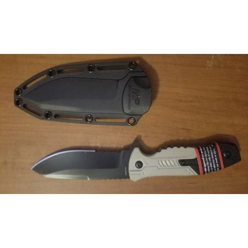 M&P. 22.10cm overall. 10.30cm 8Cr13MoV black finish partially serrated stainless blade. Black and brown rubberized aluminum handle. Full tang. Black plastic belt sheath. Boxed.
