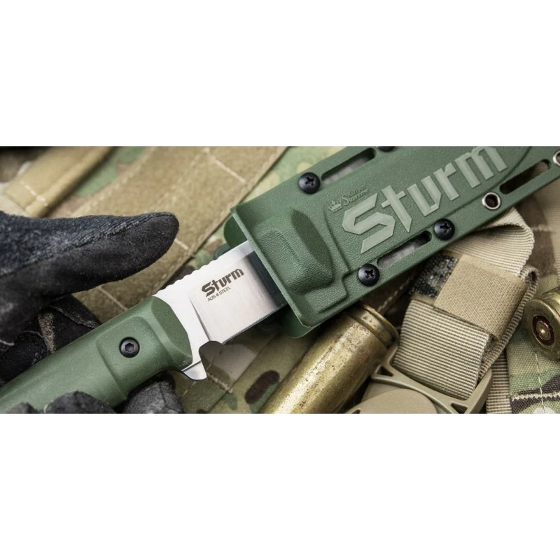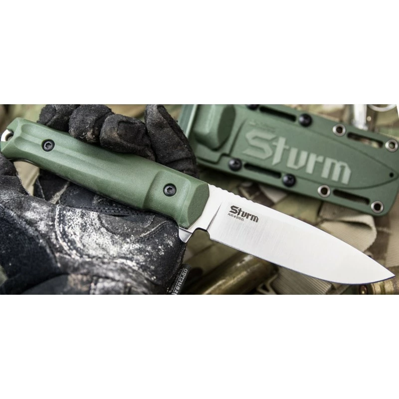 Couteau Tactical Survie Kizlyar Sturm à lame fixe – Longueur totale 25.08cm – Longueur de lame 10.79cm – Construction d’une seule pièce – Full Tang – Epaisseur de lame 4.31mm – Lame en acier AUS-8 – Dureté 57-59 HRC – Lame de type trailing point plain edge finition satin – Plaquettes du manche en green kraton/abs – Garde intégrée dans le manche – Etui green kydex multi-position – Made In Russia