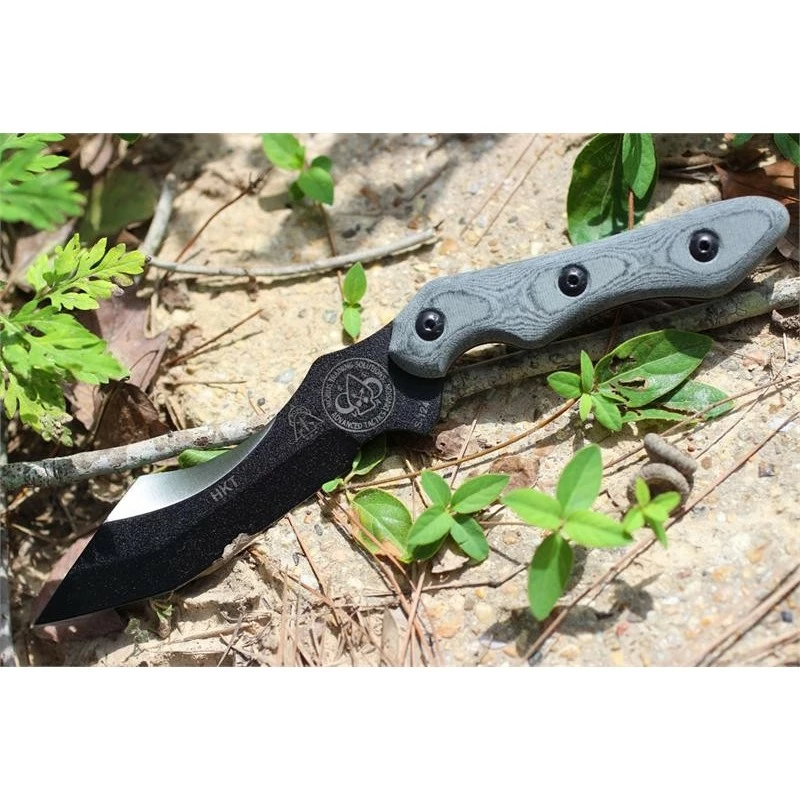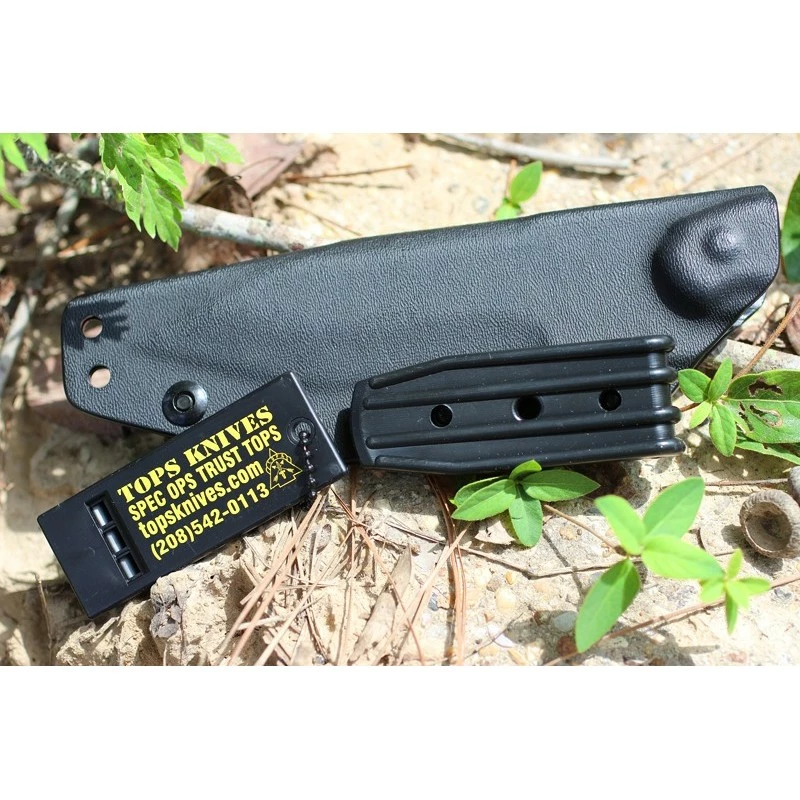 HKT (Hunter Killer Tracker) – 9 1/4″ overall. 5″ 1095 high carbon steel blade with black traction coating. Full tang. Black linen micarta handles. Molded black Kydex sheath with clip. Comes with bonus TOPS Survival whistle. The HKT design incorporates a broad cutting surface and an offset grip angle in order to better facilitate the forward thrust style of attack, in addition to slashing. The wide bodied blade of the HKT is complimented by the signature concave strike face of the Back Bite fighting knife to facilitate supreme combative application.