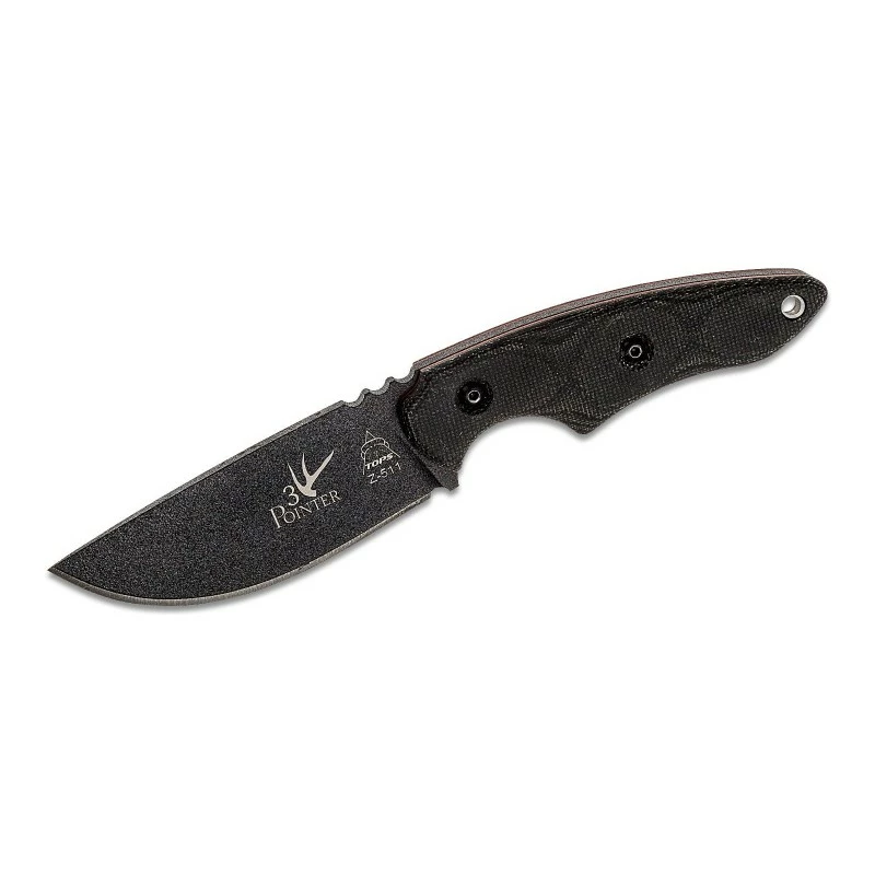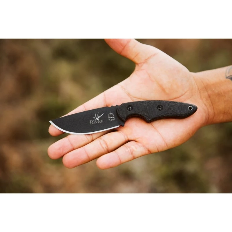 TP3PR01 TOPS Knives 3 Pointer 1095 Black Blade Black Micarta Handles Kydex Sheath Made USA