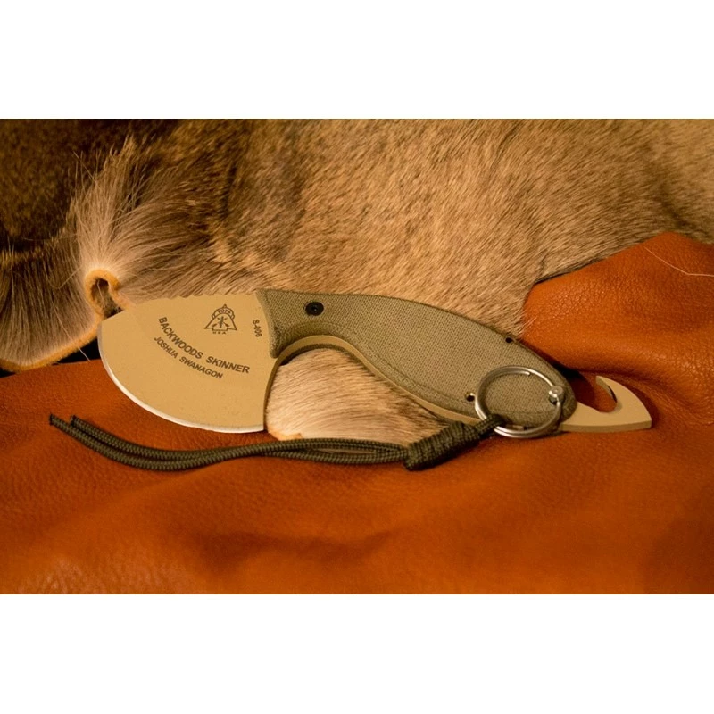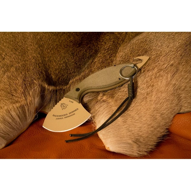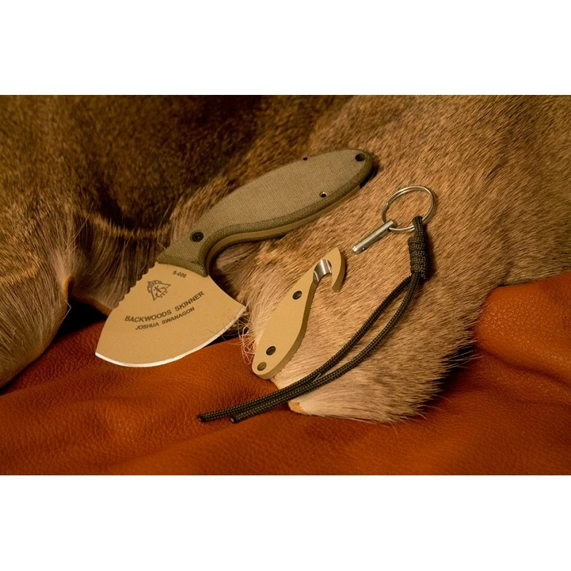 TOPS Backwoods Skinner – 6 3/4″ overall. 2 7/8″ coyote tan finish 1095 high carbon steel deep bellied skinning blade. Full tang. Green canvas micarta handles with deep finger choil and ovulated grips. Lanyard hole. Pommel features a grenade pin with OD green nylon cord and keyring holding in place a 2 3/4″ overall parasite guthook skinner hidden inside the handle. Black leather belt sheath with OD green nylon cord and TOPS survival whistle. Certificate of Authenticity. Instructions on using the knife as a guthook. Bulk packed. Designed by Joshua Swanagon.
