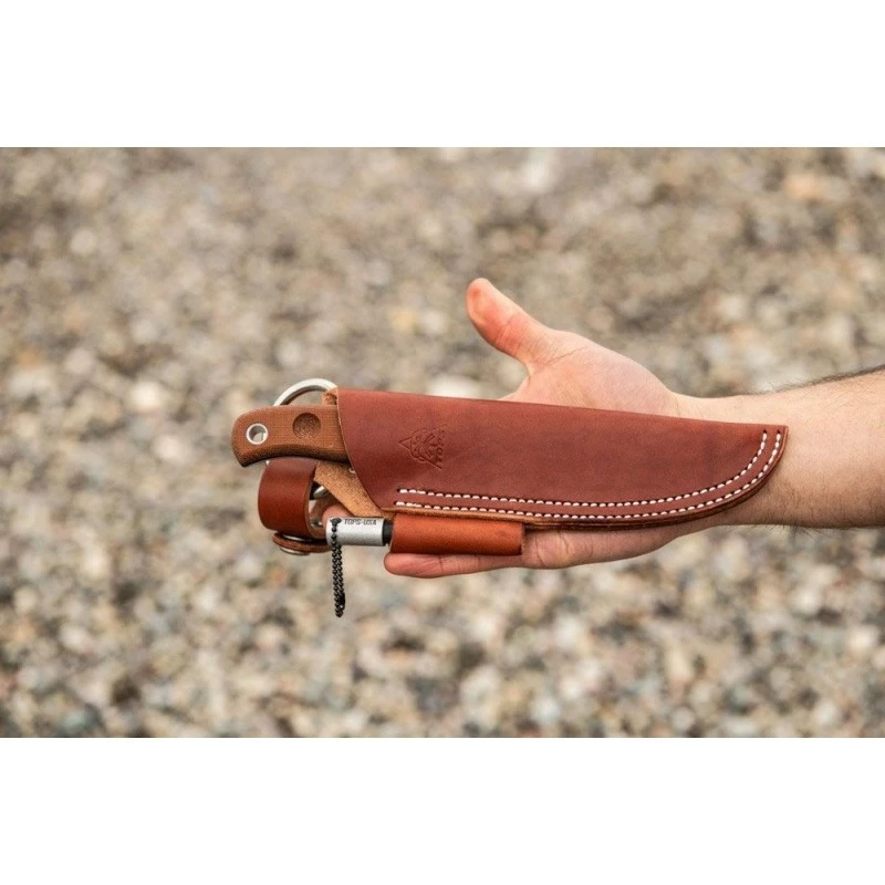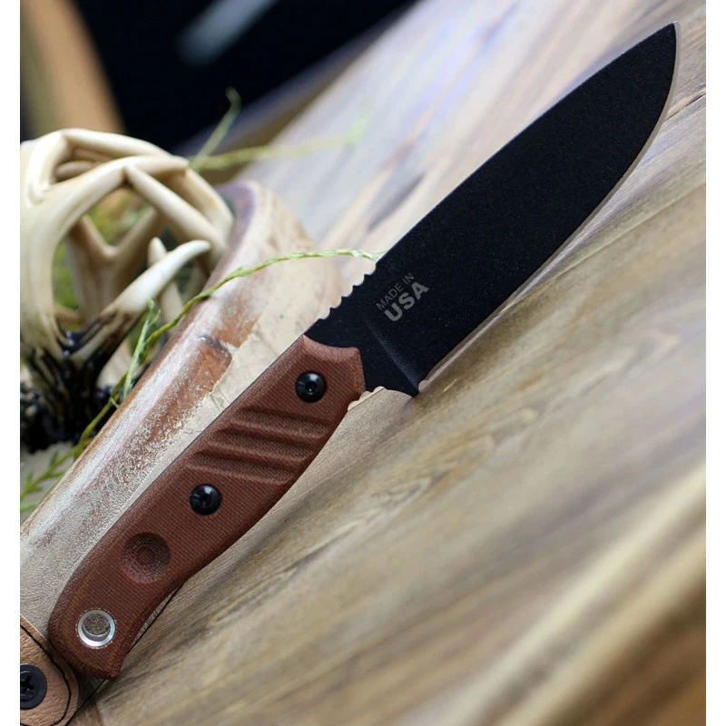 When TOPS started building knives for bushcraft outside of the tactical knives with a survival flair, black traction coating and tan canvas Micarta handles were the option on most. As TOPS has continued to be successful in that arena, many colors and finishes have been offered, but the tan and black color combo remains one of THE classic looks. Enter the Reserve Edition. Like a prized, single-malt, aged scotch, or a top-shelf cigar, the Baja 4.5 Reserve Edition looks every bit as good as those classics and comes with a quality double-stitched brown leather sheath to complete the look. So nice, you’ll want to wear it to your next black-tie affair or maybe just out into the woods. Either way, it’ll look great and get the job done.