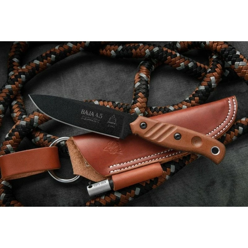 TPBAJA45R TOPS Baja 4.5 Reserve Edition 1095 Carbon Blade Tan Micarta Handles Leather Sheath USA