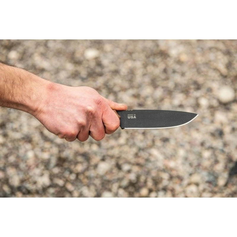 Unlike TOPS’ other models in the 4 to 4.5-inch range, this one is 5/32″ thick. That thickness along with a full flat grind gives it strength over 1/8″ blades but allows it to maintain superb cutting capabilities since it’s slightly thinner than 3/16″. Their professional heat treat gives a long-lasting edge that is easy to re-sharpen once it is eventually needed. The jimping on the spine and along the finger guard is ideal for a solid grip in hard use or slippery conditions. Due to the thinner blade, it gives you better precision and greater range from making delicate cuts to cutting thick branches with ease.