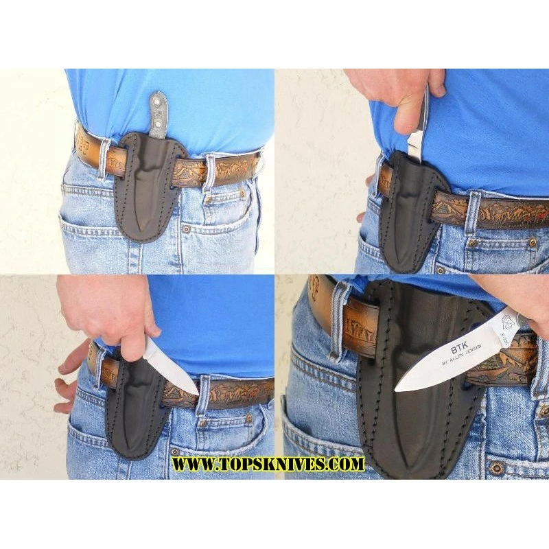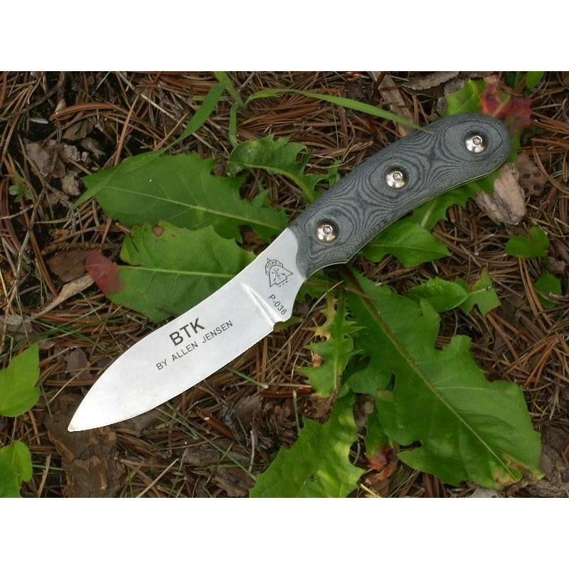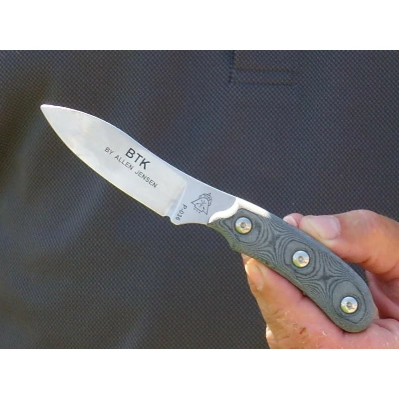 Tops Bird and Trout Knife 6 5/8″ overall. 3 3/8″ 440C stainless stone wash finish blade etched « BTK By Allen Jensen ». Cryo treated to RC 58-60. Full tang. Gray micarta handles. Black leather paddle sheath. Also includes a black TOPS emergency whistle. Certificate of authenticity. Bulk packed.Weight: 0.35lbsCountry of Origin: USA