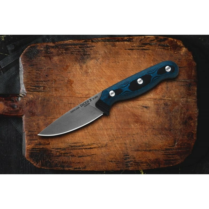 TPDCR301 TOPS Dicer 3 Paring CPM-S35VN Blade Black Micarta & Blue/Black G10 Handles Kydex Sheath Made USA