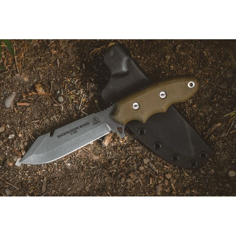 TPBPB01 TOPS Knives Backpacker’s Bowie Green Canvas Micarta 1095 Carbon Blade Kydex Sheath USA