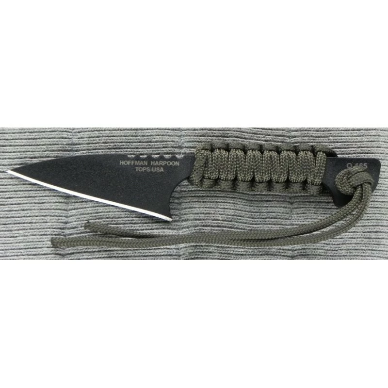 Tops Mini Hoffman Harpoon – 5 1/2″ overall. 2 1/2″ 1095 high carbon steel blade with black traction coating. OD green cord wrapped handle. Leather neck sheath. Lanyard. Made In USA
