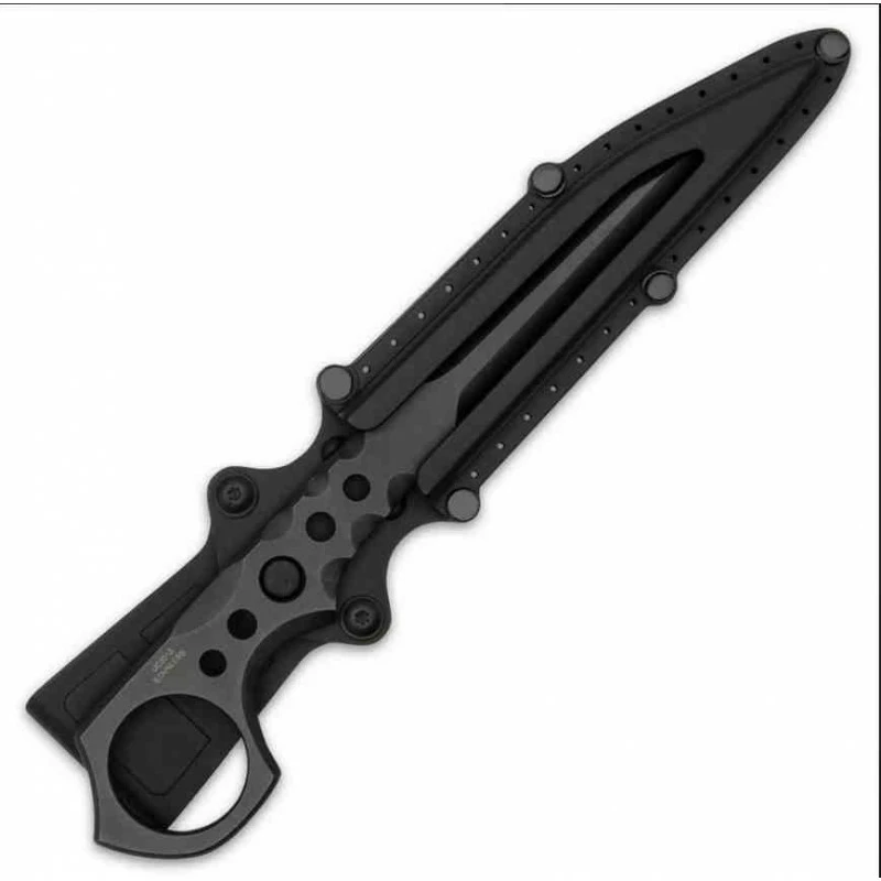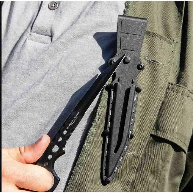 The Undercover CIA Stinger II takes the popular original model to a new sleek, and slim level of discreet self-defense. The stinger knife is crafted expertly from one, solid piece of 3Cr13 stainless steel with a non-reflective, black coating. The razor-sharp, slim blade is 8.89cm in length and goes down to a straight-edged penetrating point. The handle has CNC-beveled edged and grooves for a secure grip and has an open-ring pommel and thru-holes. The 18.41cm overall stinger knife snaps securely into an injection-molded nylon sheath with a removable belt loop.