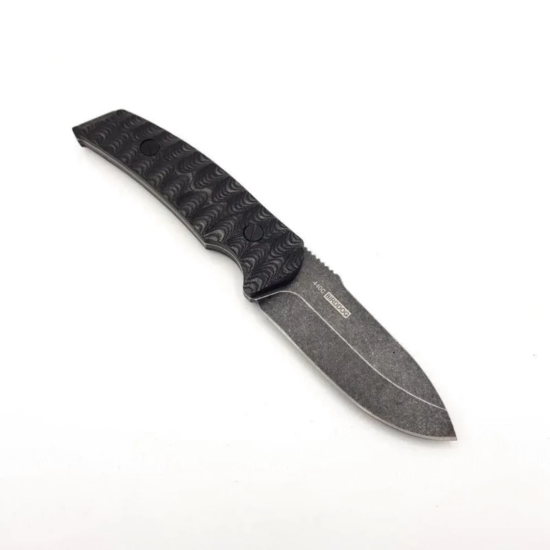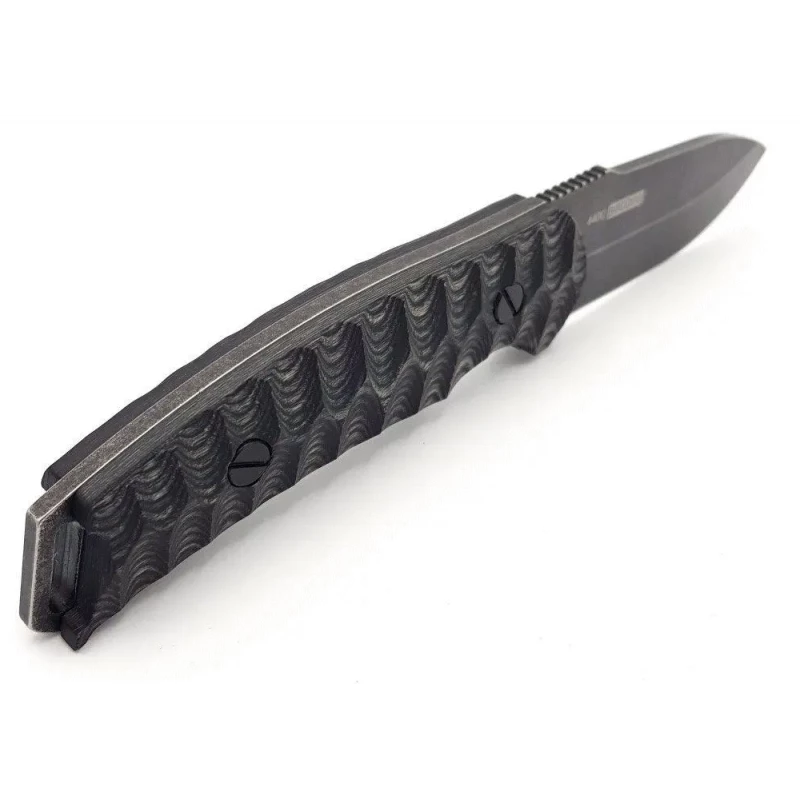 21.59cm overall. 8.89cm black stonewash finish 440C stainless blade. Thickness blade 4mm. Black and gray sculpted pakkawood handle. Full, extended tang. Lanyard hole. Black leather belt sheath. Boxed.