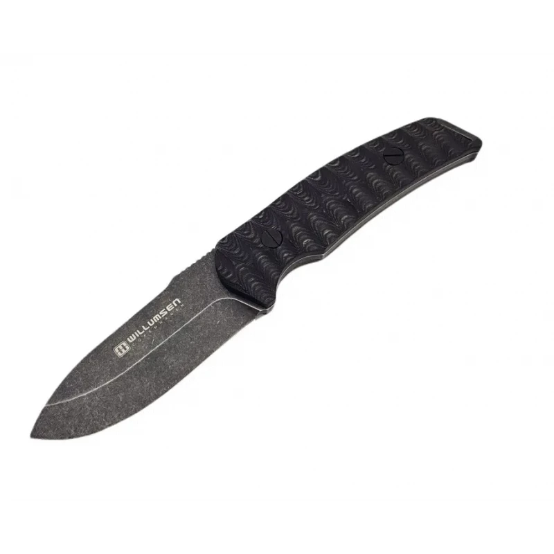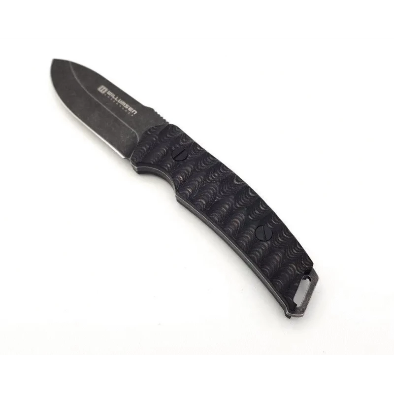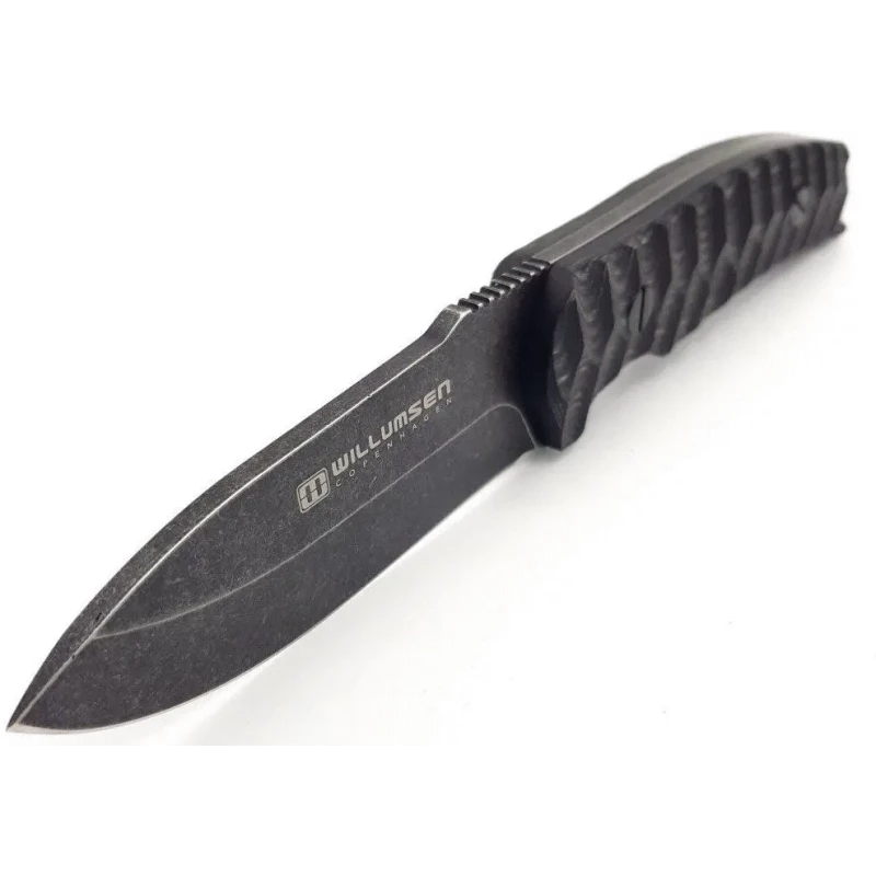 Couteau Bushcraft EDC Willumsen Copenhagen Birddog 440C Blade Wood Handle Leather Sheath à lame fixe – Longueur totale 21.59cm – Longueur de lame 8.89cm – Epaisseur de lame 4mm – Lame de type drop point plain edge finition stonewash – Lame en acier 440C – Dureté 58-59HRC – Construction d’une seule pièce – Full Tang – Plaquettes du manche en bois black & gray – Trou dans le manche pour dragonne – Etui cuir