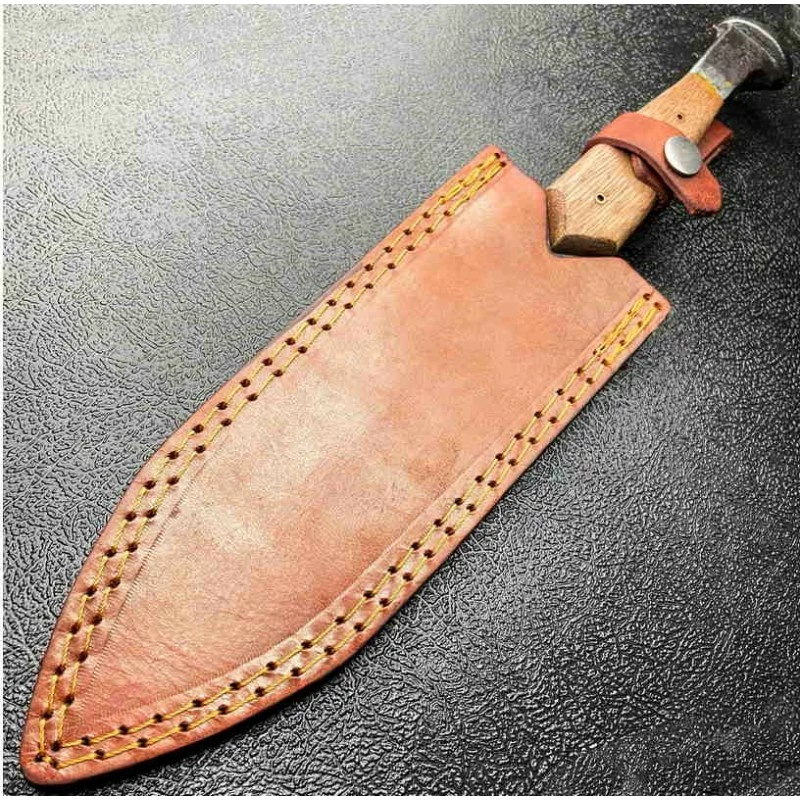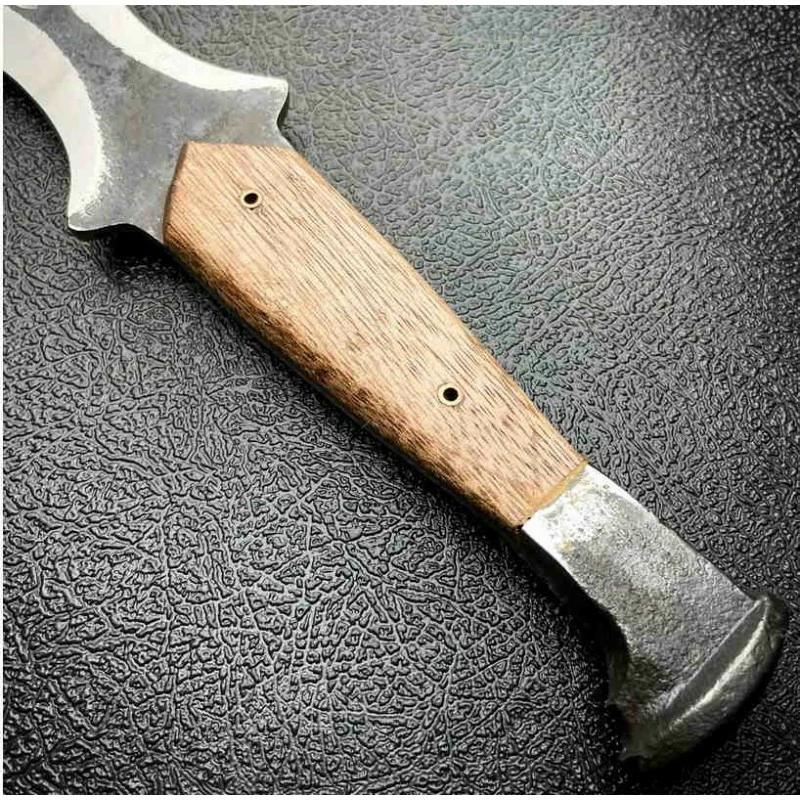 Hand made custom railroad spike knife. 33.02cm overall. 17.78cm forged Carbon blade. Brown wood handle. Carbon pommel. Full tang. Brown leather belt sheath. Boxed.