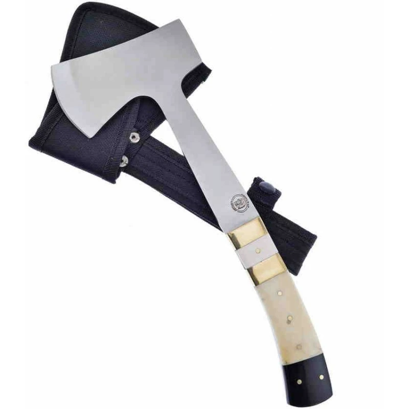 Chipaway. 27.94cm overall. 11.43cm satin finish stainless axe head with 5.41cm cutting edge. Black and white smooth bone handle. Full tang. Black nylon belt sheath. Boxed.