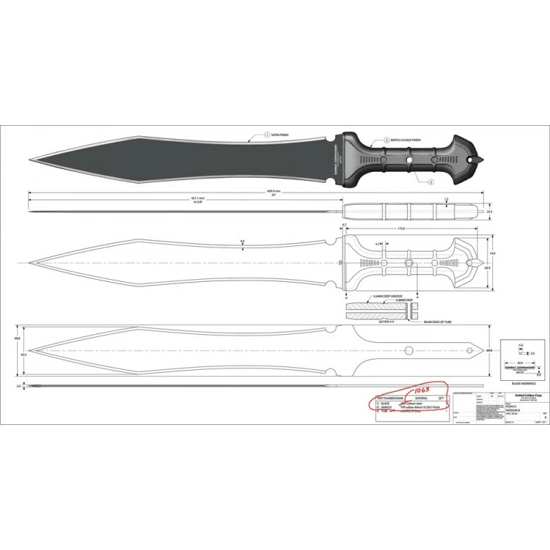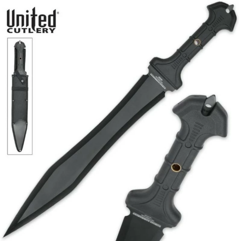 Epée United Cutlery Combat Commander Gladiator Sword 1060 Carbon Blade à lame fixe – Longueur totale 60.96cm – Longueur de lame 42.22cm – Epaisseur de lame 3mm – Lame en acier carbone 1060 – Lame de type glaive double edge finition noire – Construction d’une seule pièce – Full tang – Manche en TPR – Trou dans le manche pour dragonne – Etui nylon