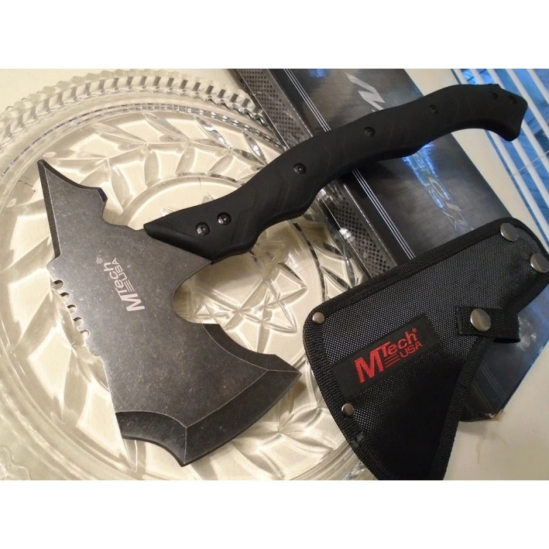 MTAXE13SW Mtech Axe Stonewash – 14 1/4″ overall. 7 1/8″ stonewash finish stainless axe head with 3 1/2″ cutting edge and spike on opposite end. Black rubberized ABS handle with lanyard loop. Black nylon sheath.