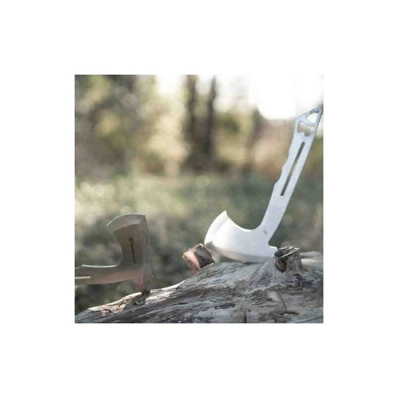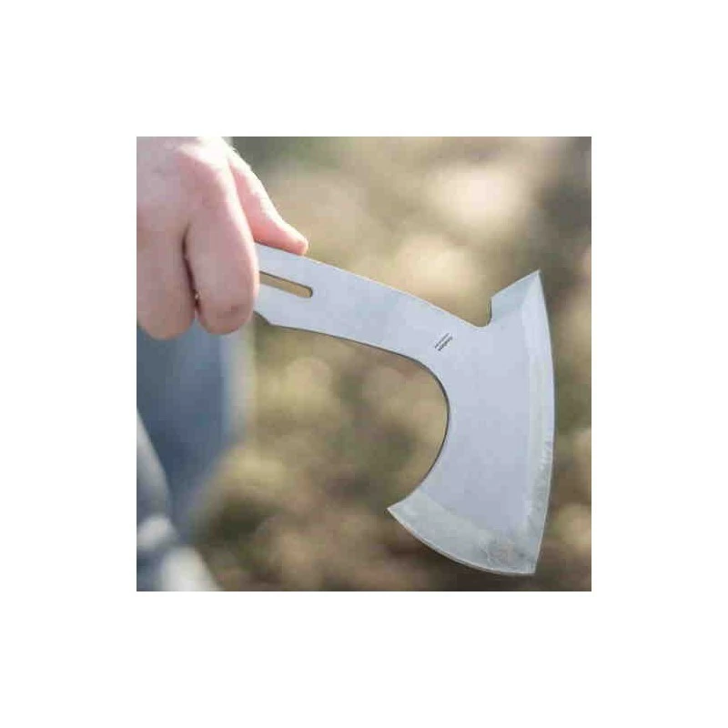 27cm overall. 12.70cm satin finish stainless axe head with 6.68cm cutting edge. Thickness 3.81mm. One-piece construction. Lanyard hole. Bottle opener. Three piece set. Black nylon belt sheath. Clam packed.