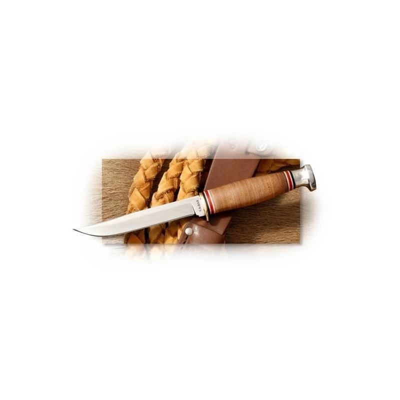 Couteau Spécial Rando – Pêche – Chasse Prestigieuse maison KA-BAR Fixe – Longueur totale : 17.46 cm Lame de 9.20 cm environ Lame polie façon miroir Acier Haute teneur en carbone DIN 1.4116 Manche en Cuir Livré avec Housse de rangement en cuir