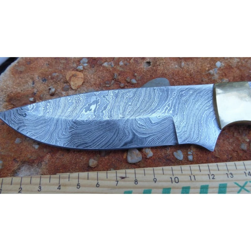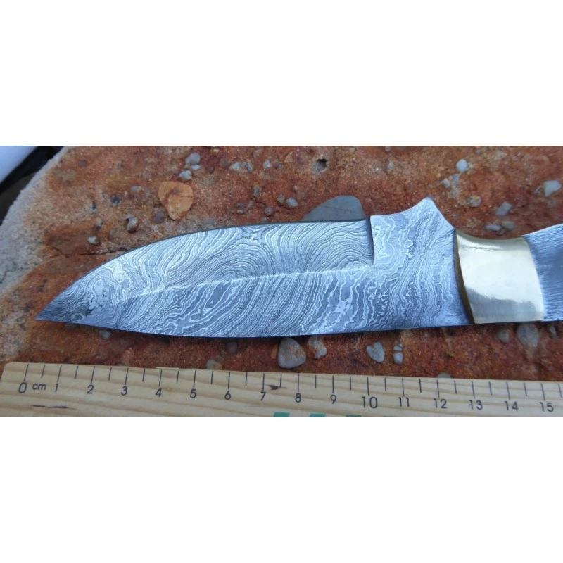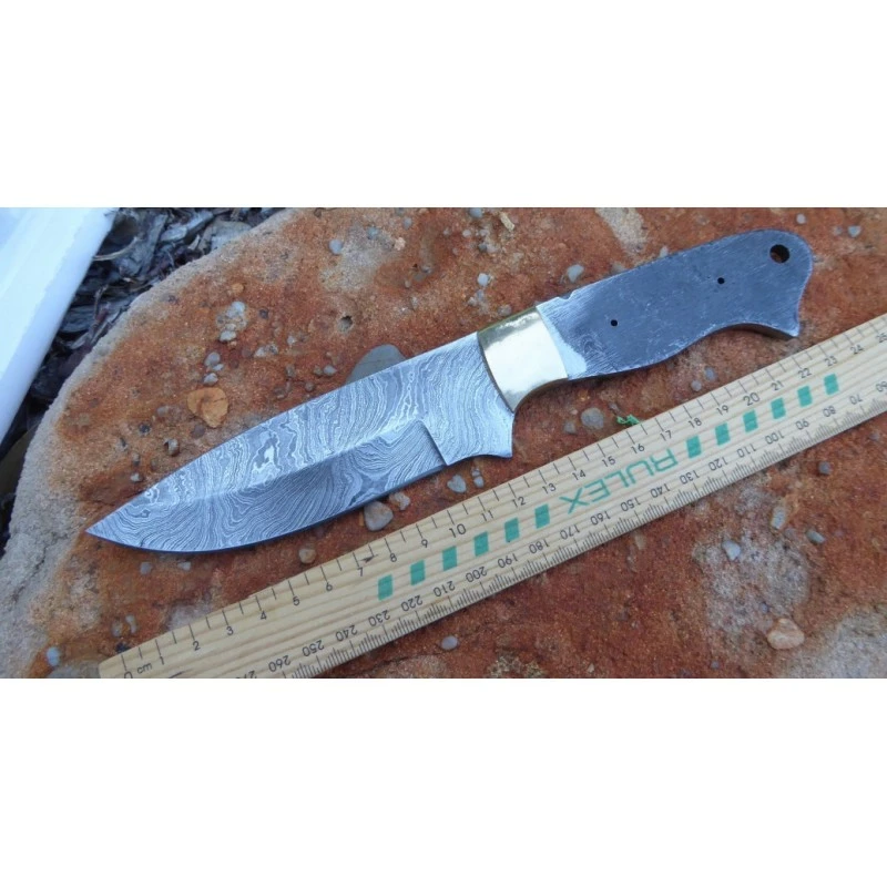 Lame de poignard, bowie, couteau de chasse, skinner à lame fixe – Longueur totale 24cm – Longueur de lame 11.50cm – Lame de type drop point plain edge – Epaisseur de lame 3.5mm – Lame en acier damas 256 couches – Garde en laiton – Construction d’une seule pièce – Full tang – Trous pour le manche