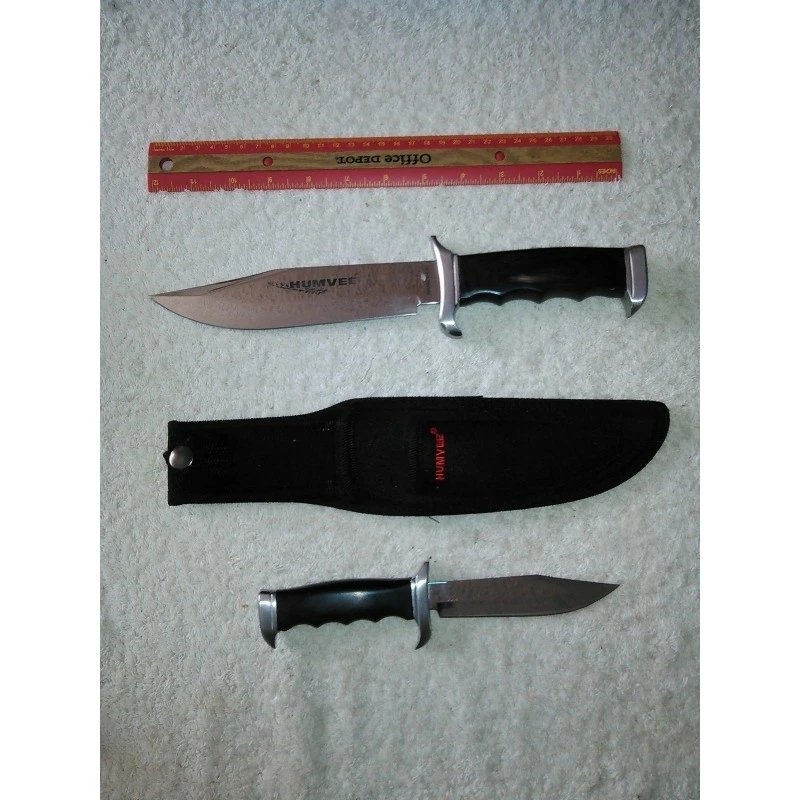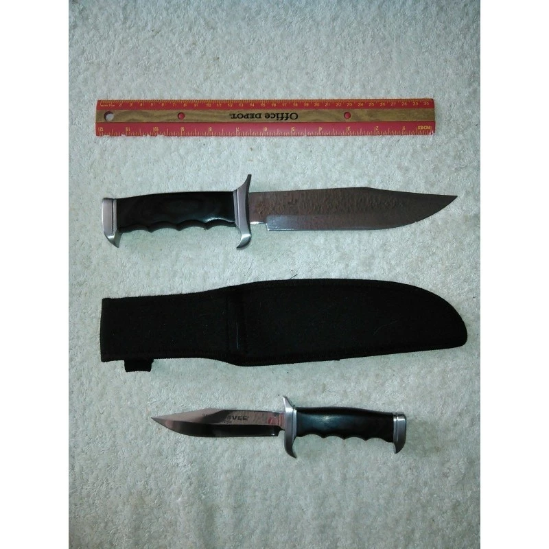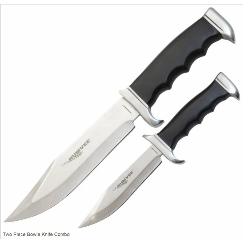 Humwee Two Piece Bowie Knife Combo – Set. Includes one 12 1/4″ overall large bowie with 7 1/4″ blade and one 8 3/8″ overall small bowie with 4 1/2″ blade. Both knives feature mirror polished stainless blades, black fingergrooved pakkawood handles with stainless guards and pommels. Embroidered black nylon belt sheath holds both.