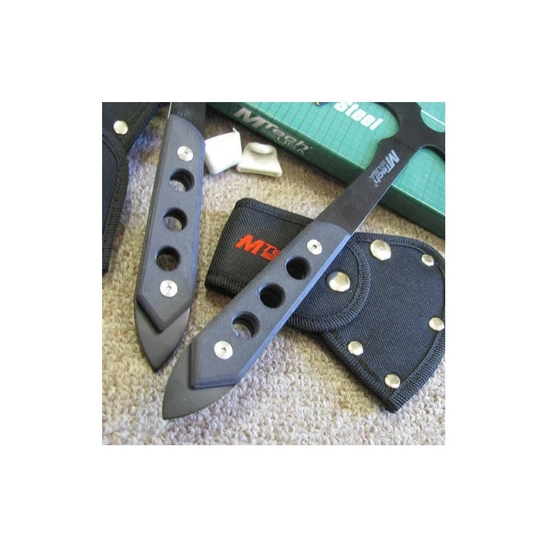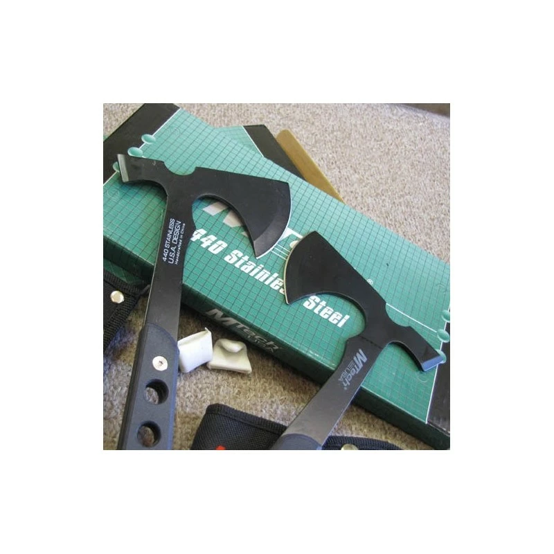 Lot de 2 Haches Tomahawk Tactical ou Lancer Mtech – Longueur total 24.13cm – Longueur de la lame 6.35cm – Construit d’une seule pièce en acier 440 – Longueur de la tête 11.43cm – Manche en G-10 – Etui nylon