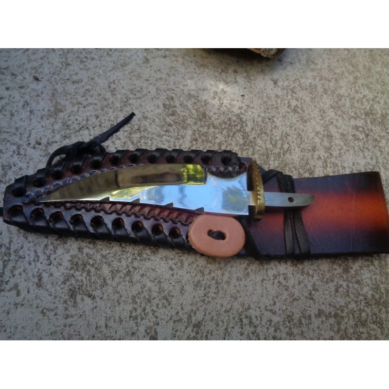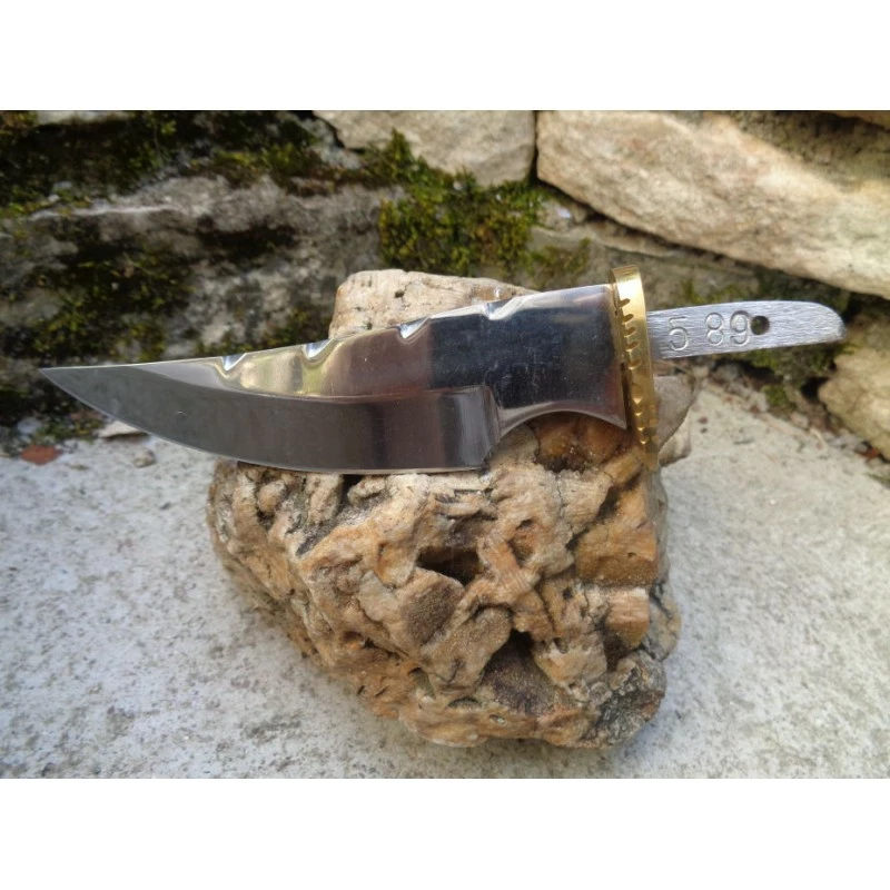 Blade. 15.87cm overall. 9.52cm mirror finish stainless clip point blade. Brass guard. Brown leather belt sheath. Boxed.