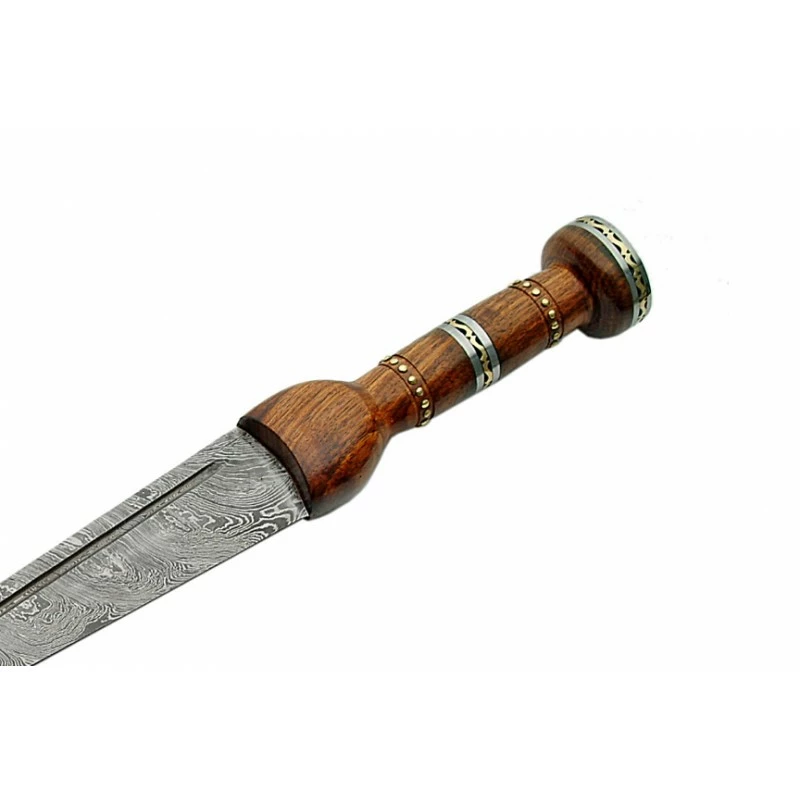 50.80cm overall. 34.92cm Damascus steel double edge blade. Brown wood handles with nickel silver and brass trim. Pommel has star onlay. Brown leather belt sheath.