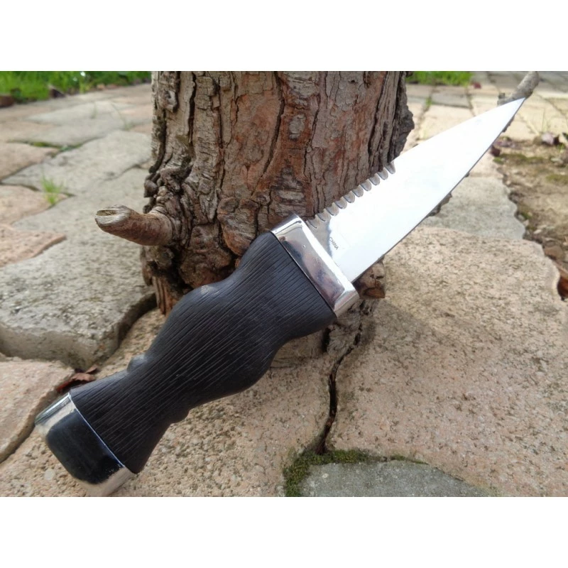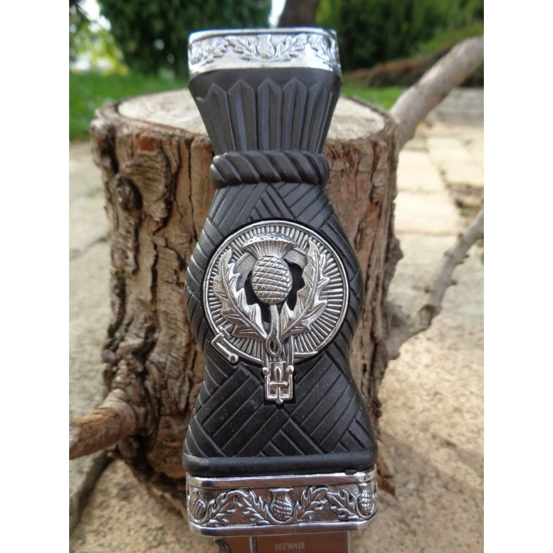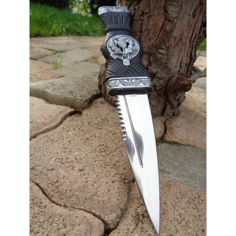 Lot de 3 Reproduction Couteau Sheffield Sgian Dubh fixe – Longueur totale 24cm – Longueur de lame 11.50cm – Lame en acier inox – Manche en abs – Haut de la lame partiellement serrated – Gouttière sur la lame – Etui en abs – Décor sur le manche & sur l’étui – L’originale est au musée d’Edimbourg – Sgian Dubh