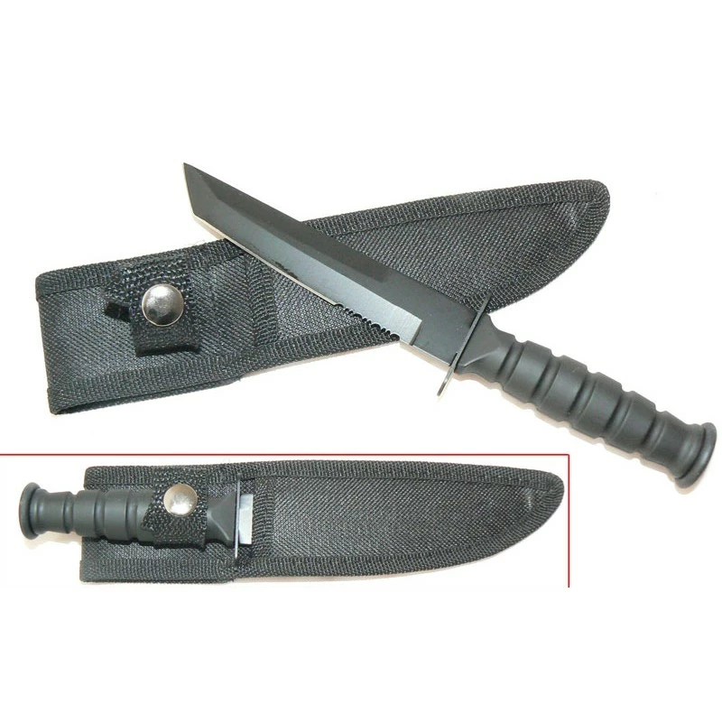 19.05cm overall. 10.79cm Black finish stainless partially serrated tanto blade. Grooved black rubber handle with black finish stainless guard and pommel. Black nylon belt sheath.