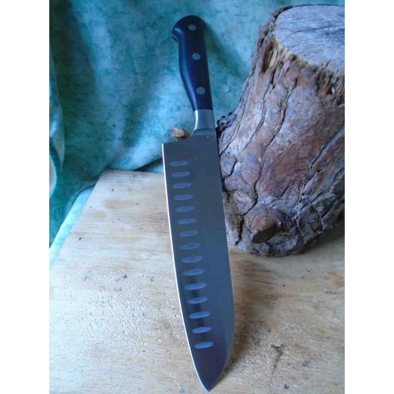 Lot de 3 Couteaux de Cuisine Santoku à lame fixe – Longueur totale 31.75cm – Longueur de lame 18.41cm – Lame en acier carbone/inox forgée – Construction d’une seule pièce – Full tang – Lame de type santoku – Plaquettes du manche en abs – Ce couteau très polyvalent au tranchant parfait sera très efficace pour la découpe de vos poissons, viandes ou émincer vos légumes.