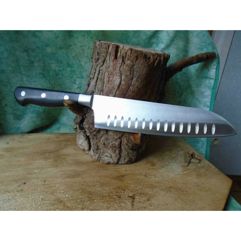 C1602A Santoku – 12 1/2″ overall. 7 1/4″ forged stainless blade. Full tang. Black synthetic handles.