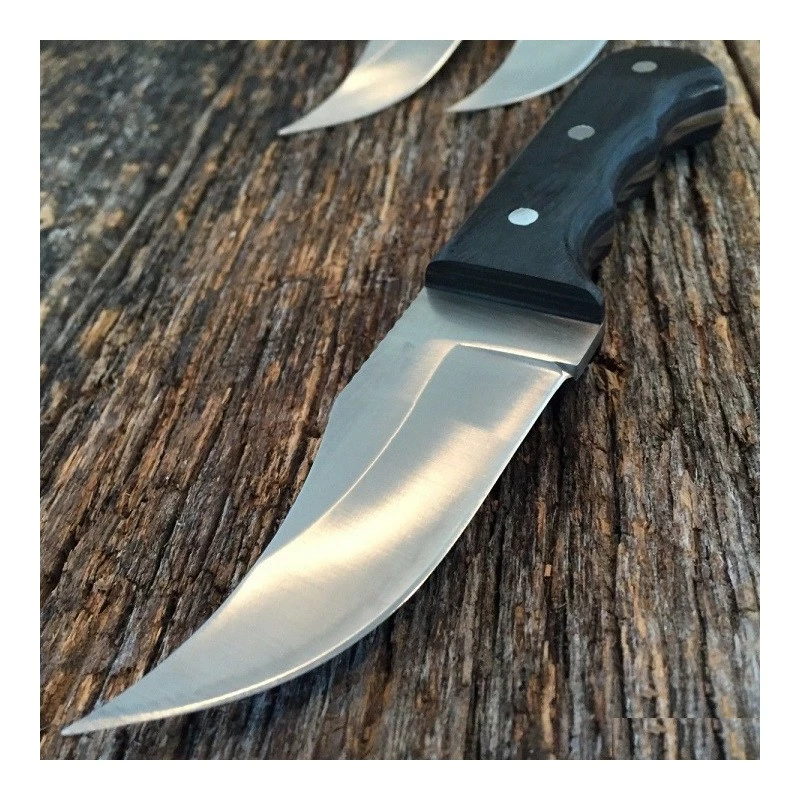 Lot de 3 Couteaux Short Skinner à lame fixe – Longueur totale 15.87cm – Longueur de lame 7.62cm – Construction d’une seule pièce – Full Tang – Lame en acier inox – Plaquettes du manche en bois – Etui nylon