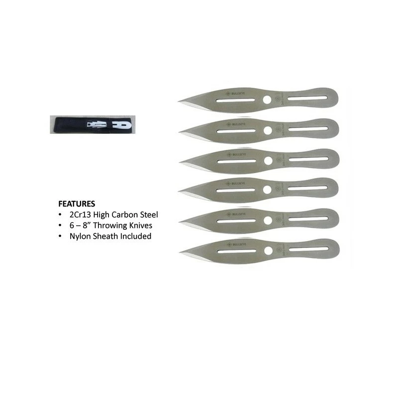 The S&W Bullseye Throwing Knife Set SWTK8CP. One piece 2Cr13 high carbon stainless steel. 8 inches overall length. Includes 6 knives and nylon sheath.