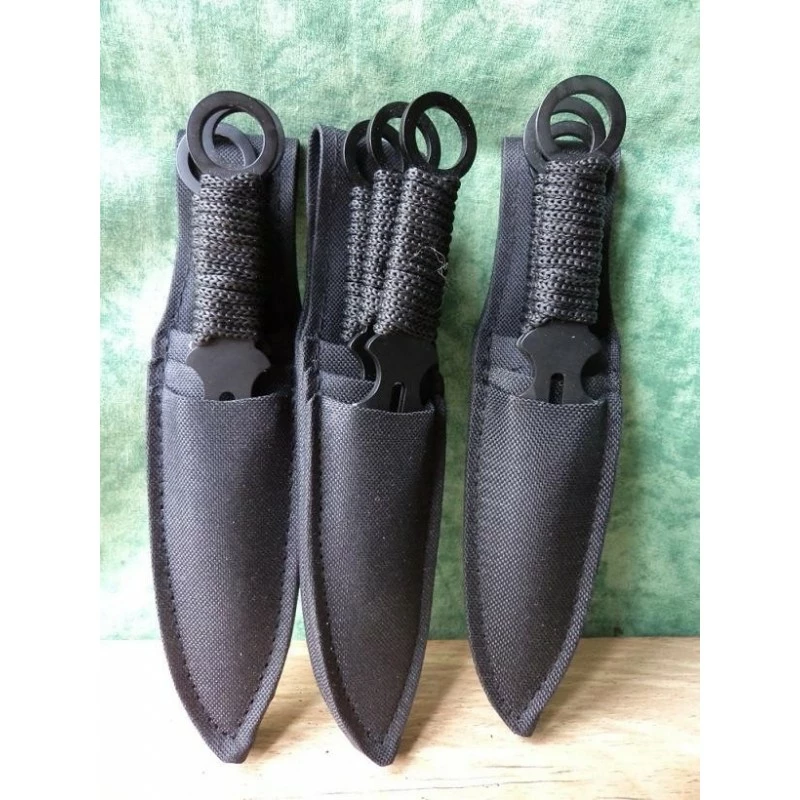 3 Set de 3 couteaux de lancer fixes – Longueur totale 16.51cm – Longueur de la lame 8.25cm – Couteau construit d’une seule pièce – Couteau en acier inox teint en noir – Manche en cordelette – Etui en nylon