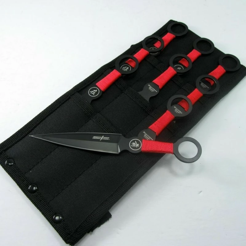 Lot de 9 Couteaux de Lancer de Ninja Perfect Point Throwing Knife Set 6 pcs Stainless Blade Nylon Sheath à lame fixe – Longueur totale 16.21cm – Longueur de lame 8.89cm – Construction d’une seule pièce – Full Tang – Lames en acier Inox – Manche corde rouge avec anneau en bout de manche – Etui de rangement en nylon