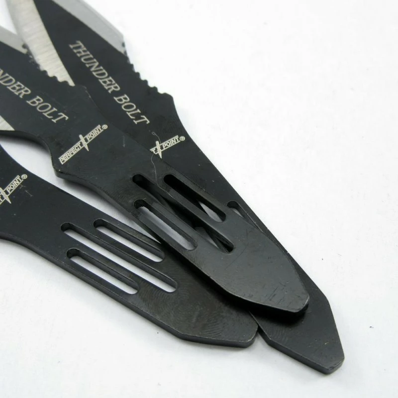 Lot de 3 Couteaux de Lancer Perfect Point Throwing Knife Black Set 3 pcs Stainless Blade Nylon Sheath – Longueur totale 13.97cm. Longueur de lame 6.99cm. Lame construction d’une seule pièce – Full tang. Lame acier inox finition 2 tons. Manche ajouré. Etui nylon noir.