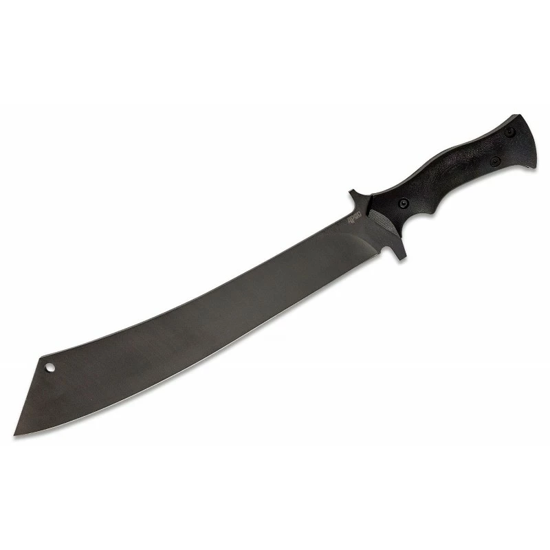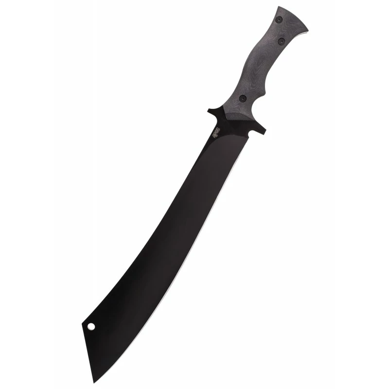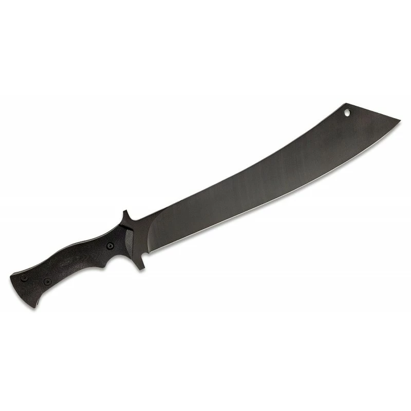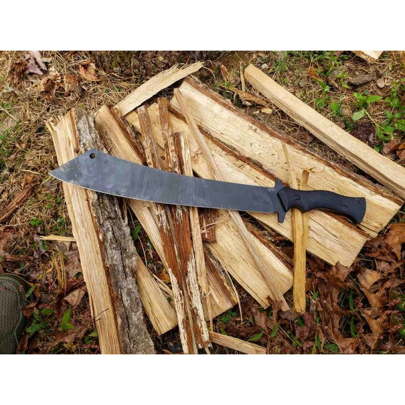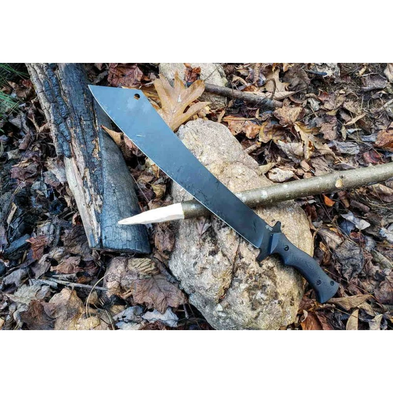 Sabre Machette APOC Survival Chop House Machete 9260 Black Blade Black G10 Handles Kydex Sheath à lame fixe – Longueur totale 45.72cm – Longueur de lame 32.38cm – Epaisseur de lame 6mm à la garde – Lame en acier 9260 – Dureté 56HRC – Dureté 56HRC – Construction d’une seule pièce – Full tang – Garde intégrée dans le manche – Plaquettes du manche en G10 – Etui kydex