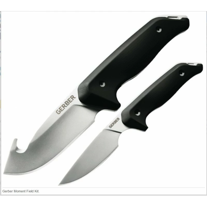 G2218 Gerber Moment Field Cleaning Kit – Includes one 8 5/8″ overall fixed blade with 3 5/8″ guthook blade and one 7 1/8″ overall caping knife with 3 1/4″ blade. Knives feature glass bead finish 5Cr15MoV stainless blades, full tang, black textured rubberized handles and lanyard slot. Black nylon scabbard holds both. Hang packaged.