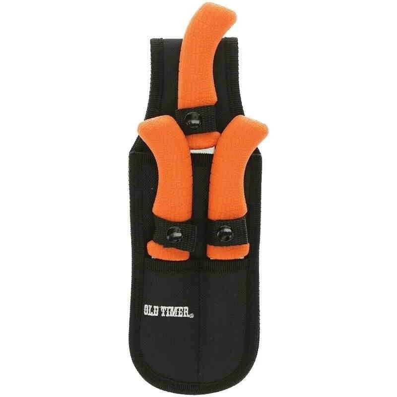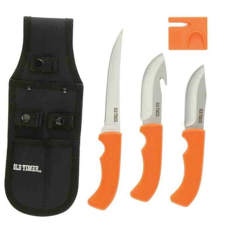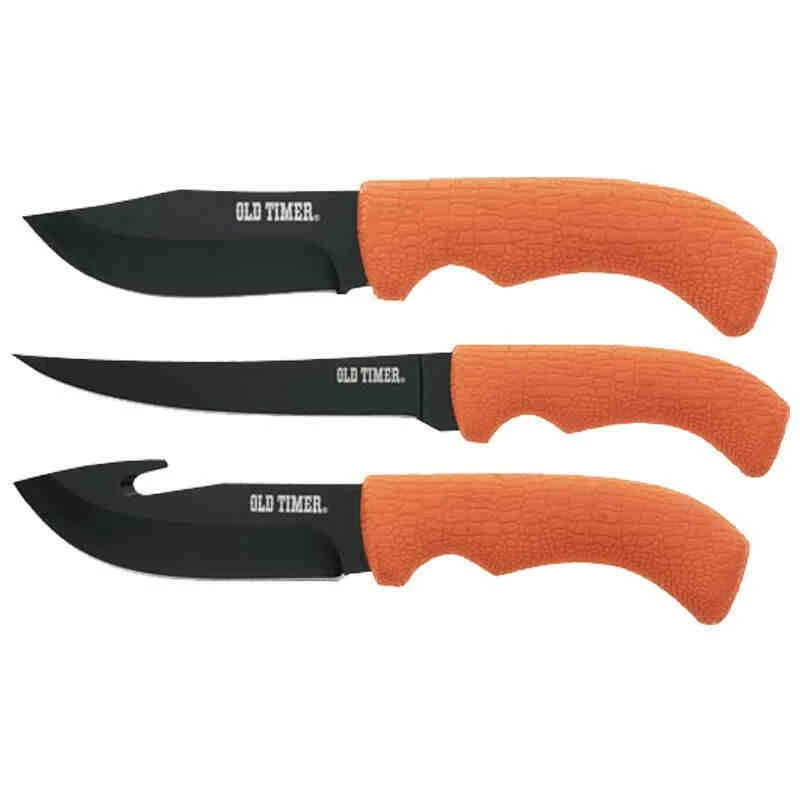 This Old Timer knife set is a great option for your hunting pack. This set includes a 24.76cm fillet knife, 15.24cm gut hook skinner knife, all purpose 19.30cm knife with drop point blade, knife sharpener, and poly sheath. They feature black oxide blades that will hold up to heavy use, rubberized blaze orange handles that allow for a secure grip, and the poly sheath makes them easy to transport.
