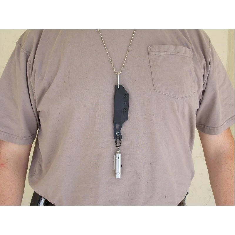 - TPCHI01 Tops Chico – 4 1/2″ overall. 1 7/8″ blade. One piece 1095 carbon steel construction with black traction coating. Black Kydex sheath with neck chain and carabiner style clip. Also comes with a blue LED mini flashlight.