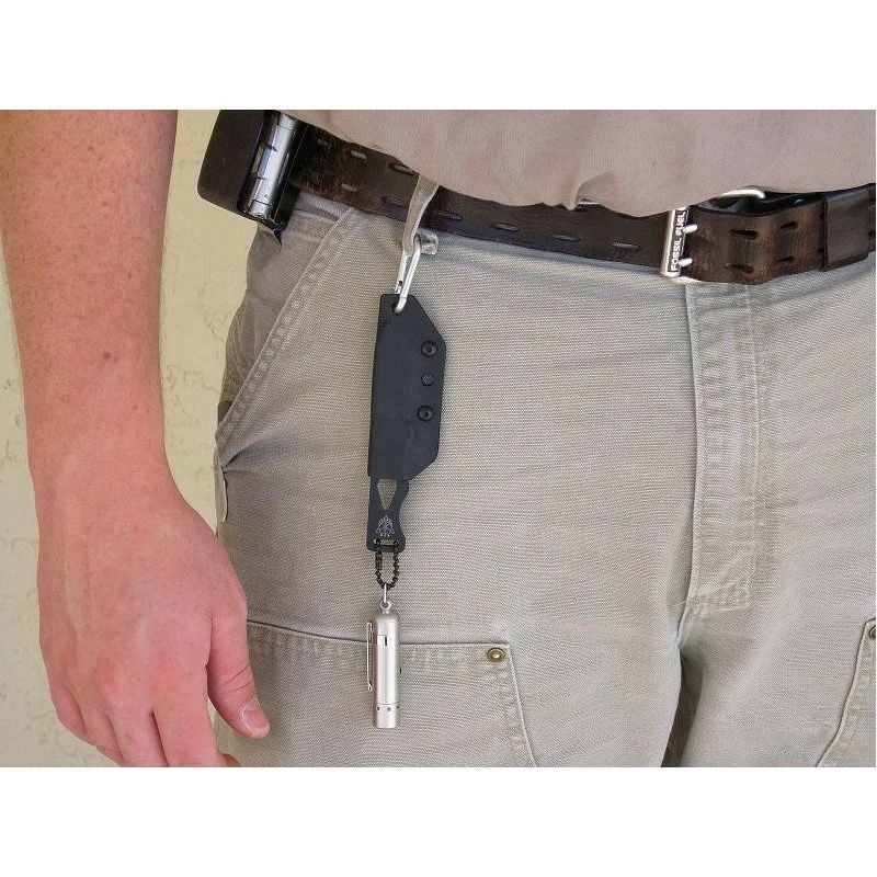 Couteau de Survie Tops Chico with LED à lame fixe – Longueur Totale 11.43cm – Longueur de Lame 4.76cm – Lame acier carbone 1095 – Construction d’une seule pièce – Full Tang – Etui en kydex avec chaine – Livré avec la lampe – Made In USA